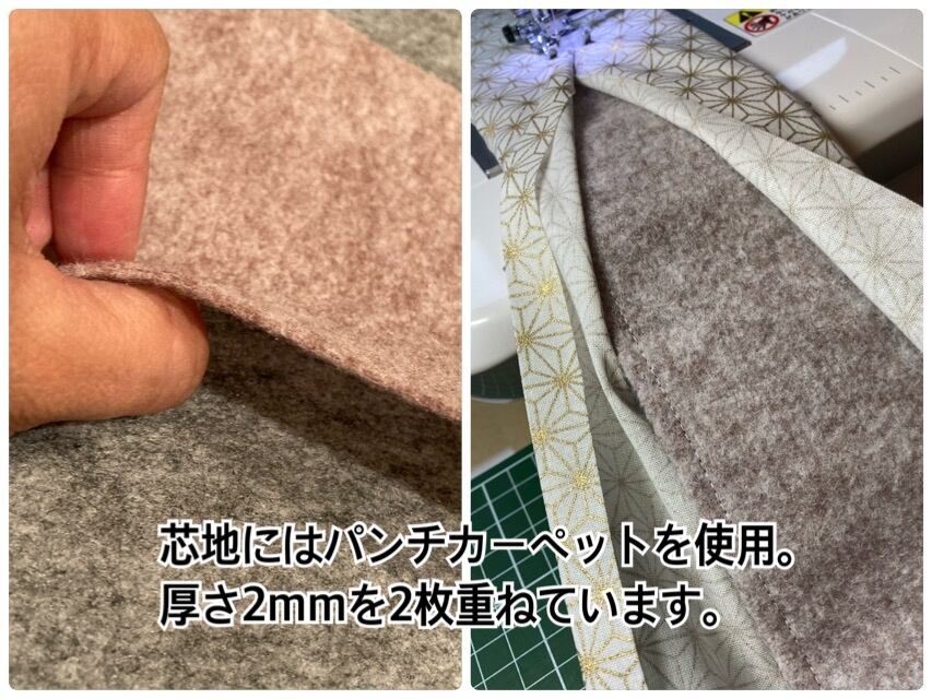 外側の素材は綿100%の布を使用。芯地にはパンチカーペット(ポリエステル100%)を使用しているため付け心地が軽く、クッション性もあります。